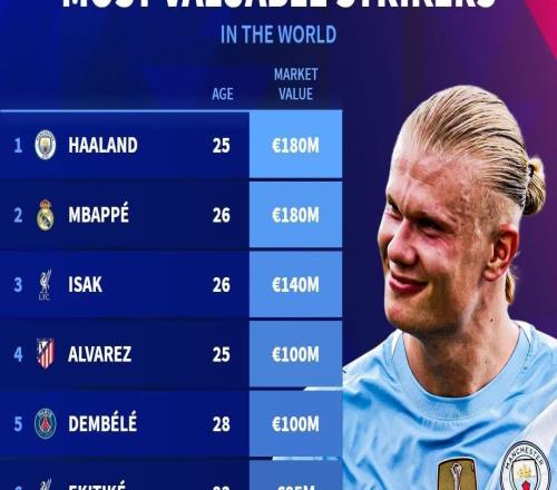 在完成最新一次身价更新后,德国转会市场网站列出了世界足坛中锋身价榜,哈兰德1.8亿欧居首,姆巴佩紧随其后。德...