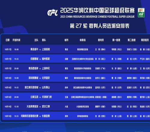 北京时间10月17日,中国足协官方公布了中超联赛第27轮裁判选派表。其中,三名女性裁判员将参与明晚天津津门虎客...