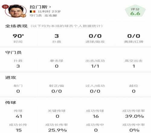 拉门斯首秀数据:3扑救、15次成功长传、出击成功1次