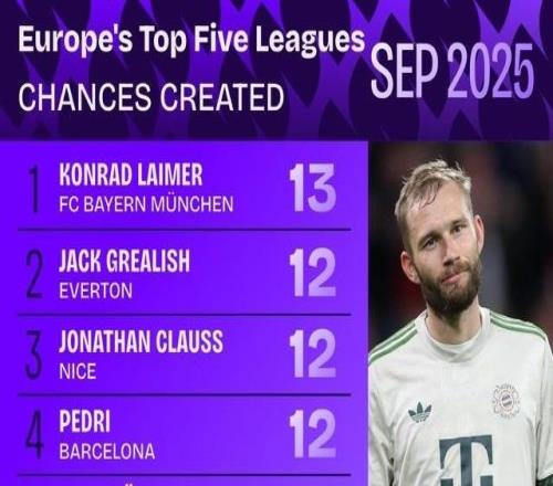 五大联赛9月创造机会榜:莱默尔第1,格10、佩德里紧随其后