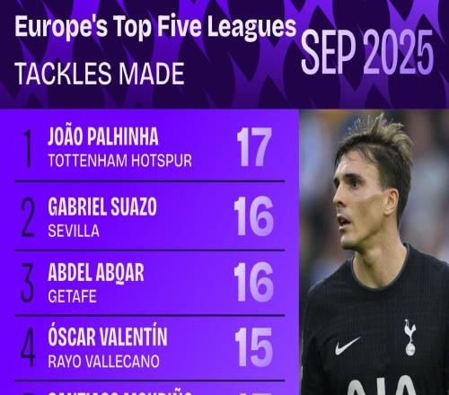 当地时间10月1日,知名数据机构Squawka发布了五大联赛九月份铲球榜,热刺中场帕利尼亚以17次铲球位居榜首。五大...