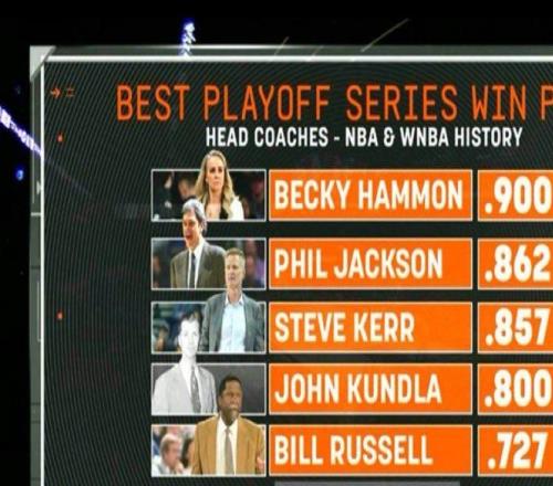 美媒晒WNBA与NBA季后赛胜率前五主教练:贝基哈蒙居首