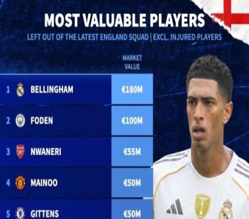 英格兰队公布了最新一期球队大名单,德转盘点了本次未能入选的球员身价榜(受伤球员除外)。1、贝林厄姆 (皇家马德...