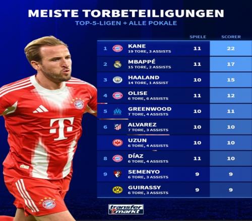 10月20日,转会市场提供了一份引人注目的统计数据,汇总了本赛季五大联赛中,球员们在俱乐部各项赛事中对进球的直...