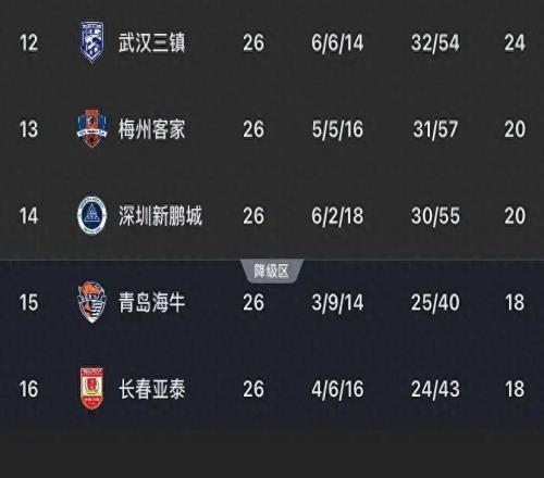中超保级区最新形势:梅州、新鹏城20分,海牛、亚泰18分