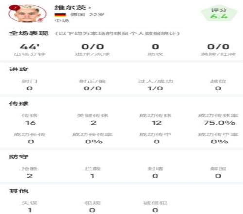 维尔茨在这场比赛里,出战44分钟,没有1次射门,1次尝试过人却没能成功。