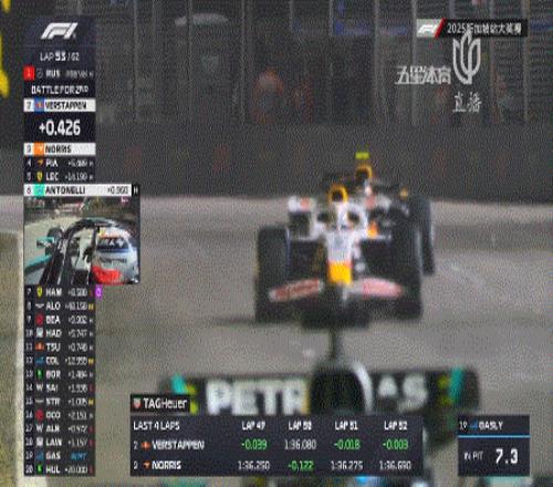 第49圈,维斯塔潘利用克拉平托的慢车卡在诺里斯身前,为自己争取了0.4秒左右的时间,但差距依旧在1秒以内!随着诺里斯也超过克拉平托,双方身前已无慢车!真正的对决开始!