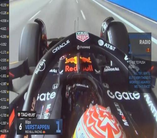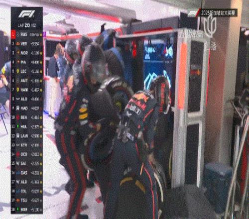 第20圈,红牛才召唤维斯塔潘进站换上白胎,出站后他压在了阿隆索身前排在第7名!此时他距离身前的汉密尔顿8秒左右,而上升到第2的诺里斯距离身前的拉塞尔有10秒的差距,这给到了双方足够的空间将赛车推向极致。