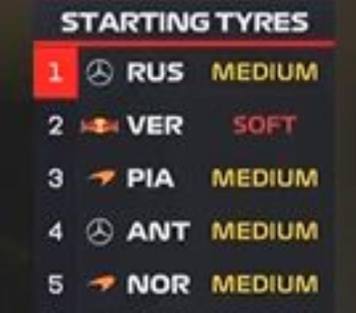 昨晚的排位赛无疑给全世界带来了惊喜!拉塞尔获得杆位,维斯塔潘紧随其后同样在头排发车,皮亚斯特里第三位起步,而排在第四的是同样来自梅奔车队的“小kimi”安东内利。而法拉利双雄于第6和第7位起步,在他们身前是麦克拉伦的诺里斯。