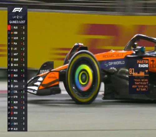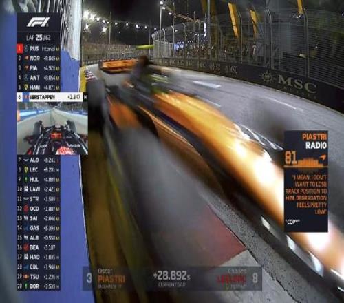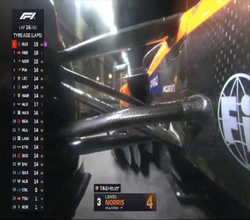 第一圈:诺里斯升至第3,但在和皮亚斯特里的争夺过程中,诺里斯碰到维斯塔潘,前翼端板受损