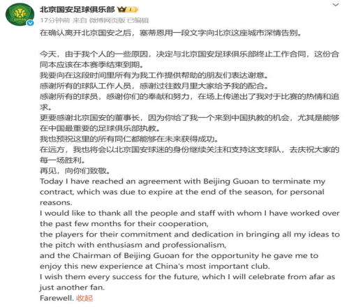 今天,由于我个人的一些原因,决定与北京国安足球俱乐部终止工作合同,这份合同本应该在本赛季结束到期。 我要向在这段时间里所有为我工作提供帮助的朋友们表达谢意。 感谢所有的球队工作人员,感谢过往数月里大家给予我的配合。 感谢所有的球员,感谢你们的奉献和努力,在场上传递出了我对于比赛的热情和追求。 更要感谢北京国安的董事长,因为你给了我一个来到中国执教的机会,尤其是能够在中国最重要的足球俱乐部执教。 我也预祝这里的所有同仁都能够在未来获得成功。 在远方,我也将会以北京国安球迷的身份继续关注和支持这支球队,去庆祝大家的每一场胜利。 再见,向你们致敬。