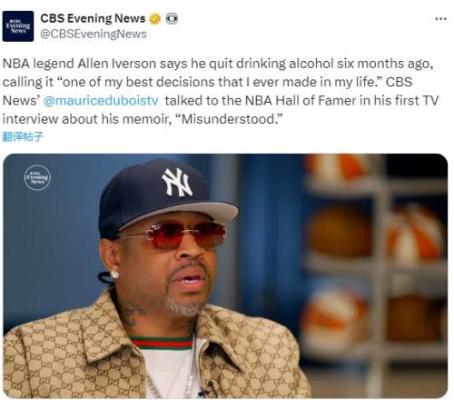 艾弗森戴着墨镜和棒球帽,胡子早已花白,他表示:我一生中做过的最正确的决定之一,就是不再喝酒。当你喝醉时,你不会是平时的自己。而当我在别人身上越来越多地看到这一点时,我就越发庆幸自己做出了这个决定。”