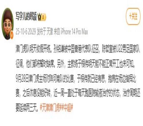 津门虎队今天的训练将以恢复、调整为主,主教练于根伟能否出现在训练场,其实也还是未知数据了解,实际上9月28日主场对阵河南队的比赛,于根伟就已经有恙,抱病在场边指挥比赛,也是因为一直坚持,情况反而更加严重,过去一周多的假期,他一直处于每天跑医院输液治疗的状态,治疗周期到今天还没有结束,不过他本人早些时候也表示,自己会尽量不耽误出勤。