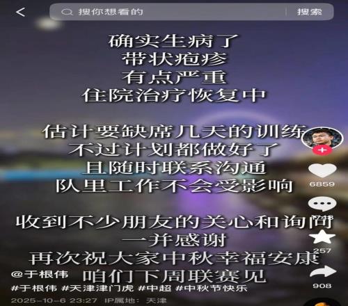 对此,于根伟本人昨天深夜在社交媒体回应:确实生病了,带状孢疹,有点严重。住院治疗恢复中。估计要缺席几天的训练,不过计划都做好了,且随时联系沟通,队里工作不会受影响。收到不少朋友的关心和询问,一并感谢。再次祝大家中秋幸福安康,咱们下周联赛见。