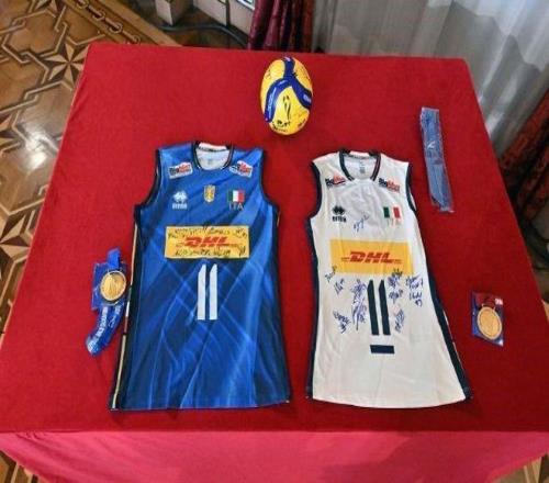 男女排世锦赛冠军意大利队接受总统、总理接见,并赠送球衣