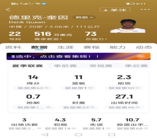 夏联阶段,他场均可出场27.1分钟,场均据是14分11篮板2.3助攻1盖帽,投篮命中率43.8%,三分命中率50%。