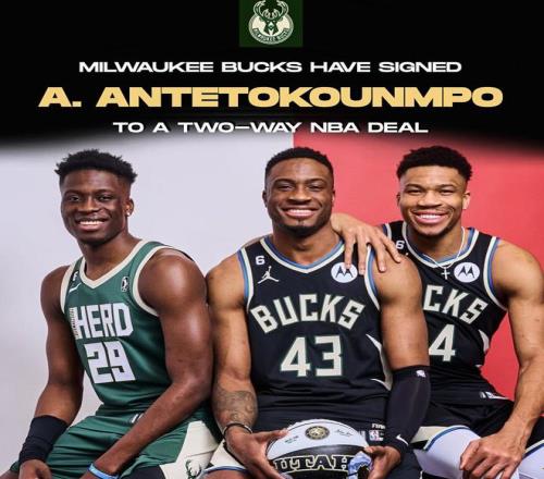 雷速体育10月14报道 名记Shams今日在社交媒体上,报道了雄鹿与字母哥的弟弟亚历克斯·安特托昆博达成双向合同,他将与两位哥哥扬尼斯和萨纳西斯并肩作战,而字母哥三兄弟也成为了NBA历史上首对同时效力同一支球队的三兄弟。
