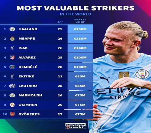 在完成最新一次身价更新后,德国转会市场网站列出了世界足坛中锋身价榜,哈兰德1.8亿欧居首,姆巴佩紧随其后。