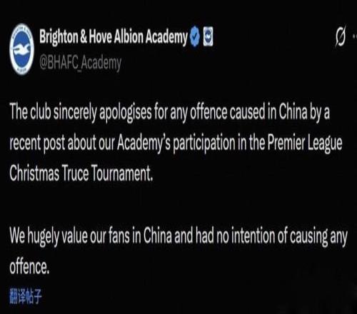 包括众多中国球迷在内的很多热爱和平的人,对布莱顿足球俱乐部进行了严厉指责。布莱顿青训学院账号删除该贴,并于11月29日发布道歉声明,就发布的关于青训学院参加英超圣诞休战活动的帖子在中国造成的任何冒犯,深表歉意。“我们非常重视在中国的球迷,绝无冒犯之意。”但该道歉帖被限制了评论。